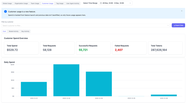 - Activity metrics: Track requests, tokens, and success rates per customer